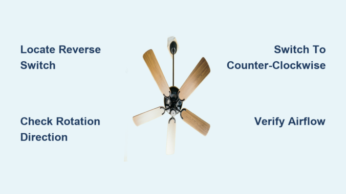 Most ceiling fans feature a small toggle switch located on the motor housing, usually on the side where the downrod connects. Before adjusting, turn off the fan completely and wait for blades to stop. Locate the switch (often labeled with summer/winter icons or directional arrows) and slide it to the counter-clockwise position. Turn the fan back on and verify the direction change by observing blade movement or feeling for the downward breeze.