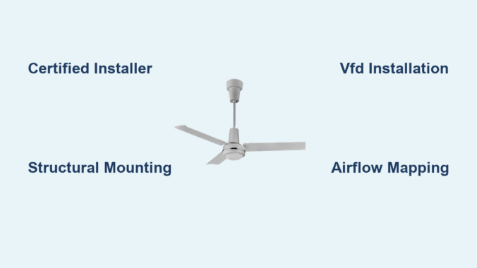 HVLS fan installation demands manufacturer-certified technicians—this isn’t optional for facility safety. Improperly installed commercial ceiling fans create serious risks: