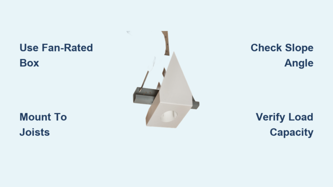 – Electrical box rating: Only use UL-listed “fan-rated” boxes explicitly marked for angled installations (e.g., “Suitable for Ceiling Fans on Sloped Ceilings”). Standard octagon boxes lack the reinforced mounting brackets needed.